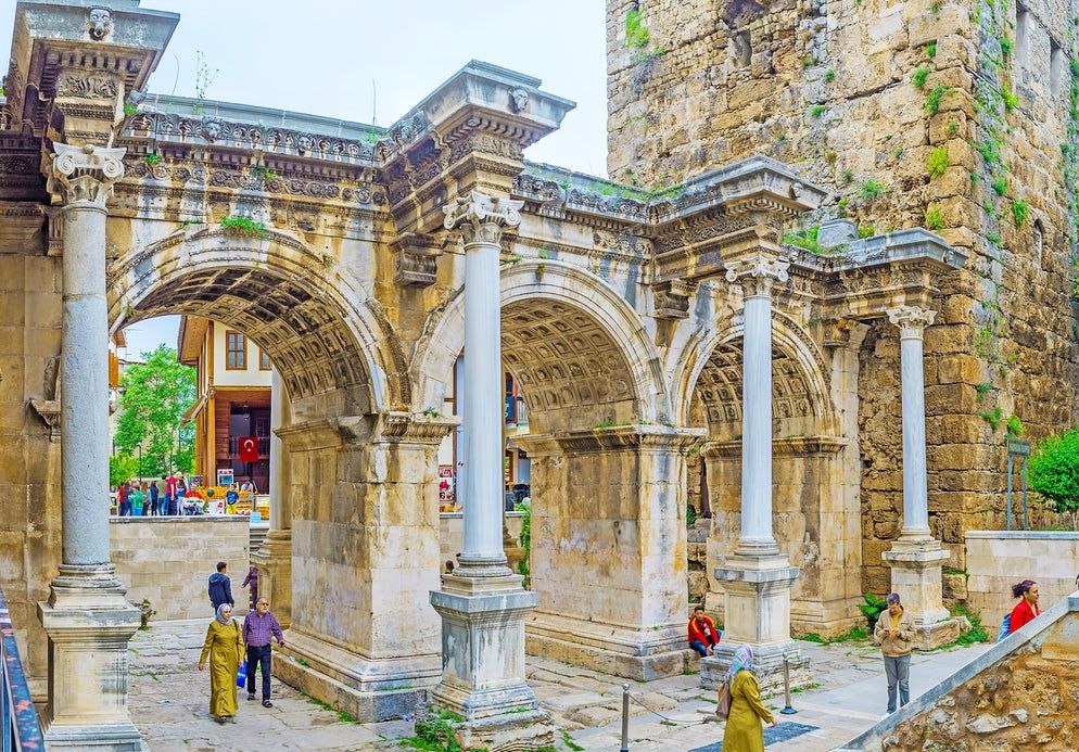 Hadrianstor: Dieser verzierte Marmorbogen wurde im 2. Jahrhundert v. Chr. von den Römern zu Ehren des Kaisers Hadrian errichtet. Es ist das erstaunlichste Gebiet in der gesamten antiken Region Pamphylien.